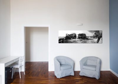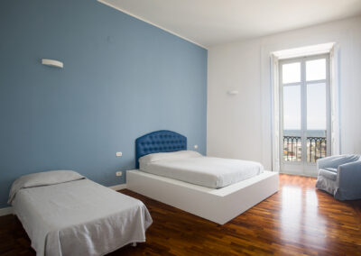 La Caracciolo è un’ampia camera matrimoniale con vista sul golfo di Napoli. La stanza dispone di due comode poltrone, armadio a muro, scrivania, televisore. Il suo colore è un celeste tenue ma deciso che richiama i colori del Lungomare Caracciolo sul quale si affaccia. Il celeste è il colore che definisce l’area della casa dedicata al B&B che predomina nelle maioliche del ‘700 che caratterizzano le prime sale dell’appartamento, le zone di ricreazione a disposizione dei clienti.