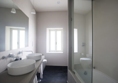 Il bagno finemente ristrutturato dispone di una vasca doccia, due lavandini con ampio specchio e finestra.